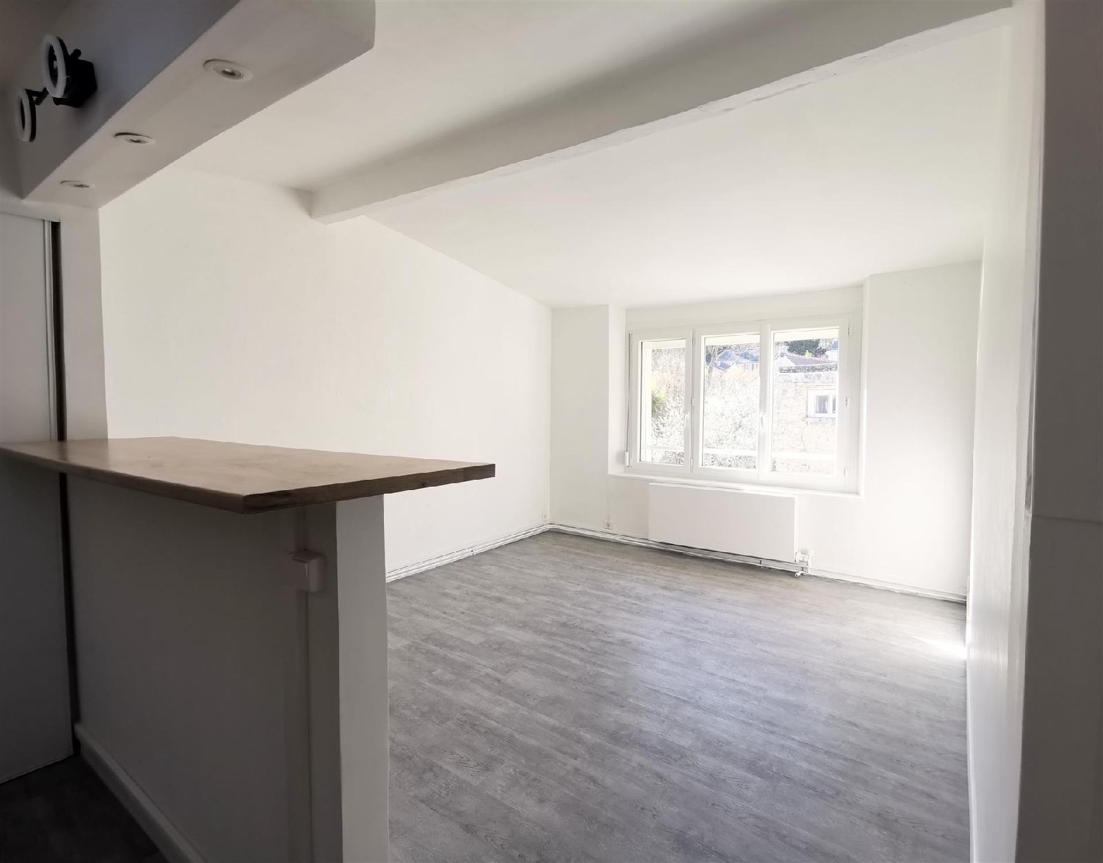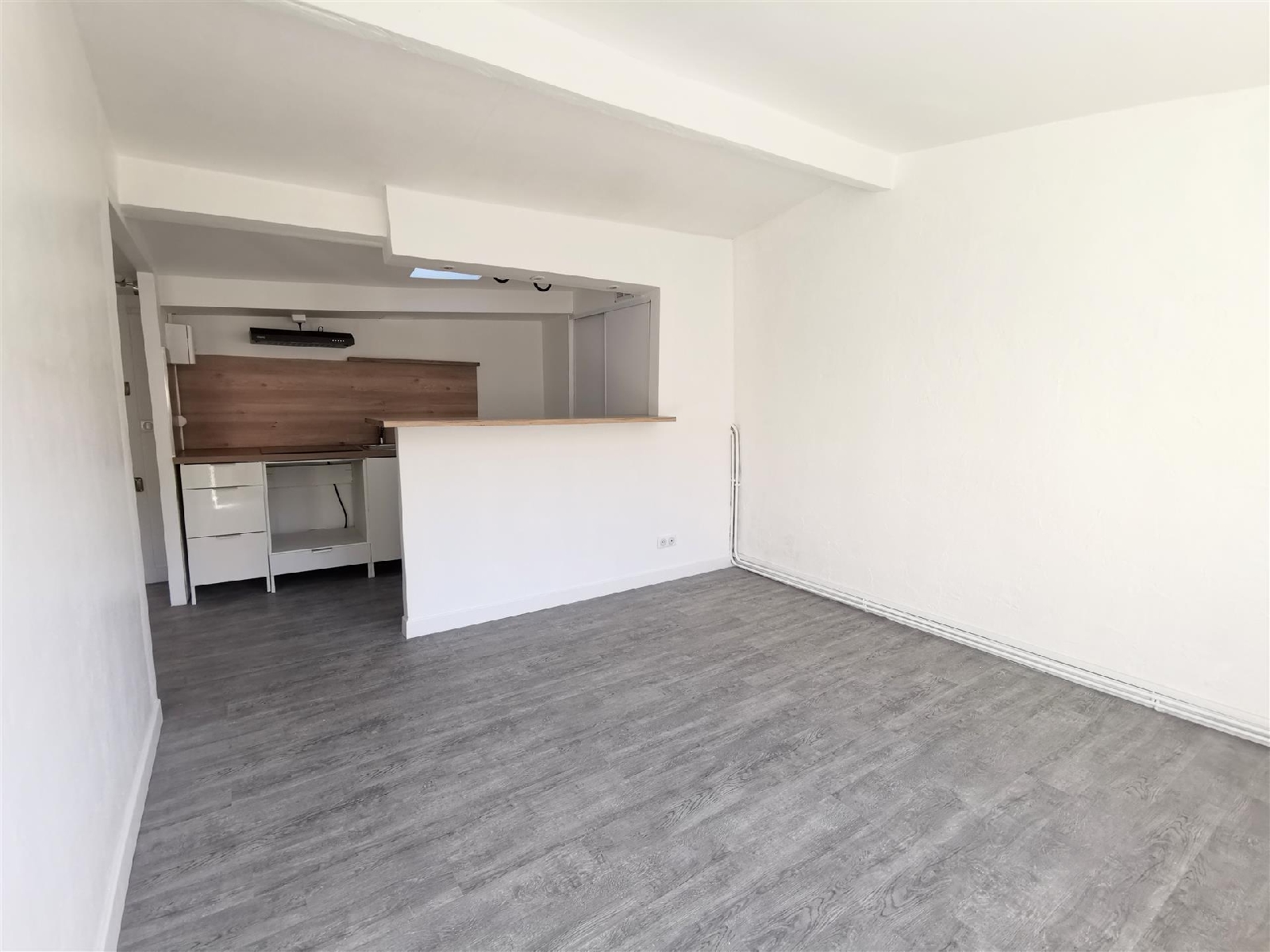 Une entrée, une cuisine aménagée et équipée (plaques électriques et hotte) ouverte sur la pièce à vivre, une chambre avec placard, une salle de bain avec WC, un placard/buanderie.