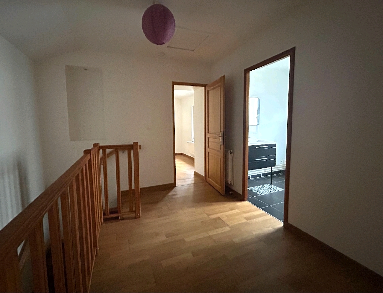 A l'étage, vous trouverez un vaste palier, deux chambres dont une avec un bel espace de rangements, 'une salle de bains avec WC.